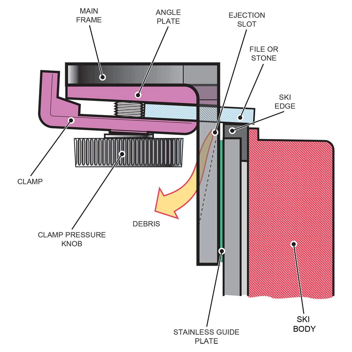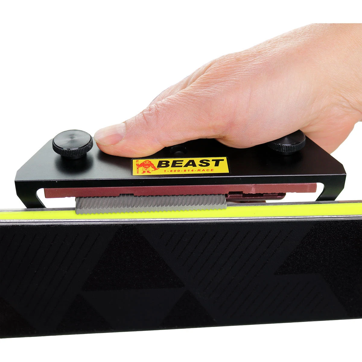 Ergonomic design positions hand away from sharp ski edge. The secure clamp prevents slippage of files or stones.
